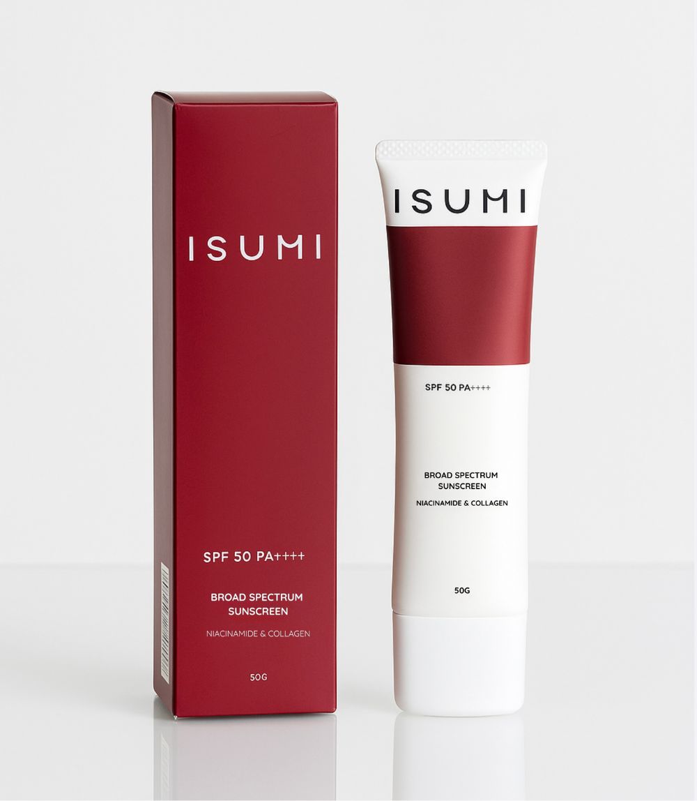 ISUMI’s Broad Spectrum Sunscreen SPF 50 PA++++ offers ultra-light, non-greasy protection with a powerful blend of anti-aging ingredients. Infused with niacinamide, hyaluronic acid, and collagen, it smooths fine lines, brightens, and hydrates while calming your skin. Ideal for daily wear, a great base for makeup, and perfect for on-the-go protection.