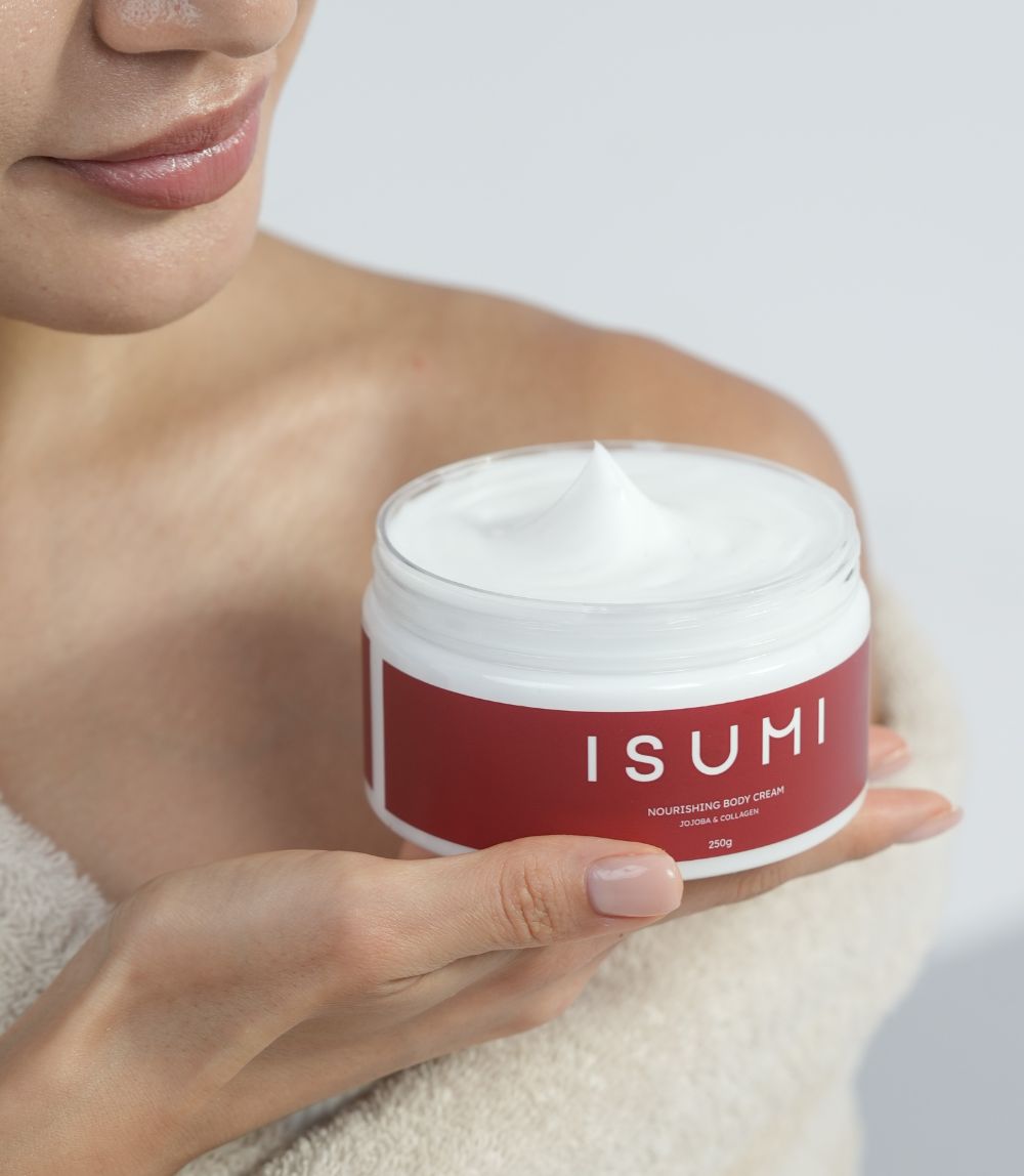 ISUMI Nourishing Body Cream provides deep hydration and anti-aging benefits with its fast-absorbing, lightweight formula. Infused with collagen, caffeine, and natural extracts, it firms, protects, and nourishes your skin, leaving it radiant and smooth.
